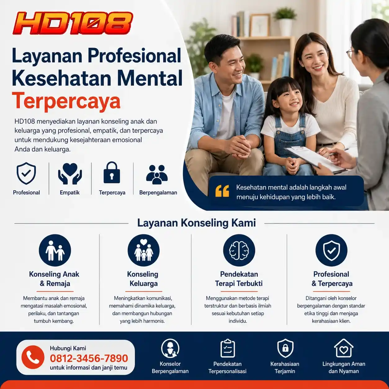 HD108 menjunjung tinggi standar profesionalisme dan kerahasiaan dalam setiap layanan yang diberikan. Kepercayaan klien menjadi prioritas utama, sehingga setiap proses konseling dilakukan dengan etika yang ketat dan penuh tanggung jawab. Dengan layanan yang terpercaya, HD108 berupaya menjadi mitra terbaik dalam menjaga dan meningkatkan kesehatan mental keluarga.